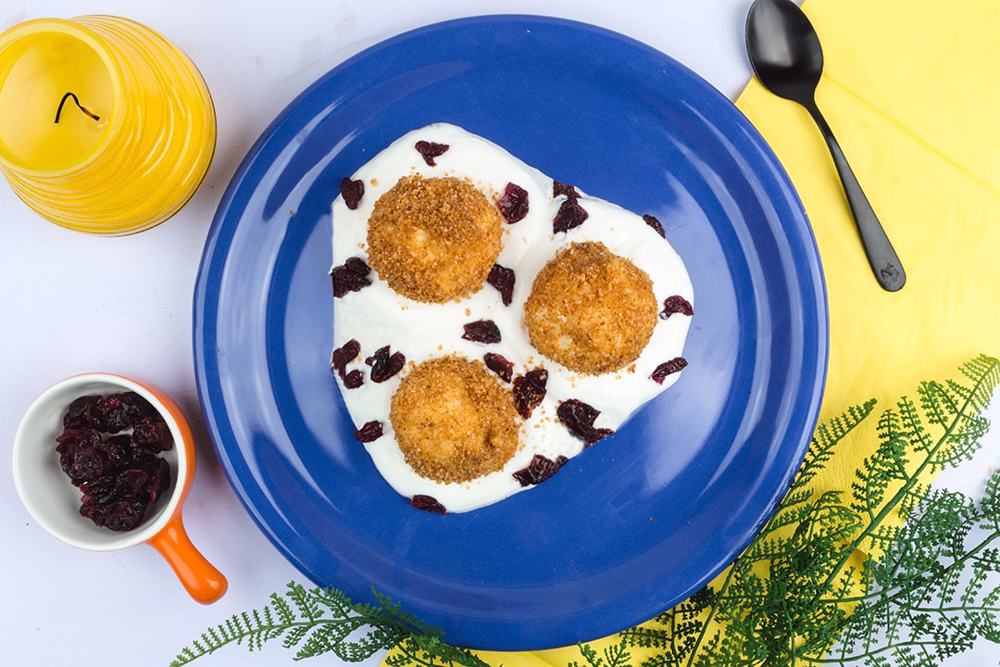Gomboti cu branza dulce de vaca, sos de smantana si merisoare